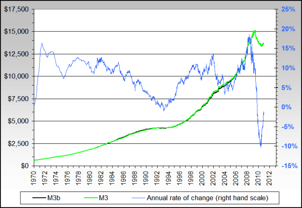 Today, corporate America having repaired its balance sheet after the dotcom bubble is in no mood for increased borrowing, U.S. consumers are looking to repair their own balance sheets after the real estate bubble and American government borrowing would already be at unsustainable levels if not for atypical financing rates. There are no more asset bubbles to blow in the U.S. So, like saturated ground when liquidity is poured into the U.S. economy by central bankers it now flows elsewhere. (The above chart courtesy of NowAndFutures.com shows the recent sharp decline for money growth in the U.S.) Nevertheless the Federal Reserve of the U.S. is doing everything it can to grow the monetary base in America resistant to the idea that America’s economy is predisposed at this point to deleveraging, rather than releveraging, debt.