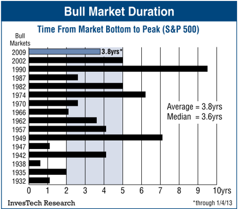 The historical case on a secular basis is scary. Unfortunately, the cyclical case for where the stock market will go over the next few years, based on history, isn’t optimistic either. Earlier in the current stock market rally, I was more bullish precisely, because it was earlier in the stock market rally. Bull markets tend to last an average of 3.8 years. But this bull market is now over four years old. The below chart compiled in January of this year shows the average duration of a bull market, and the current one is now getting old in the tooth.