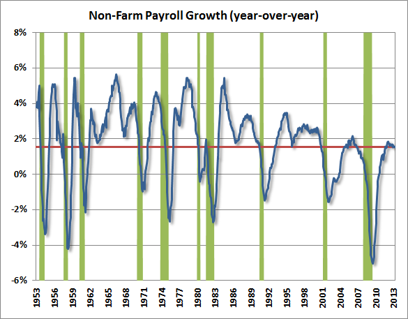 There are multiple reasons for investors to be worried the U.S. stock market is not in a new era of prosperity that has driven it into a new secular bull market and will sustain a performance lead over other countries. Of all the weakness in the U.S. economy the scariest is the job’s picture. The current stock market looks to be built on an economic foundation of sand. Not only has this been the weakest jobs recovery in the last half century, with the labor force participation rate recently hitting a 37-year low, but as the accompanying chart shows the unemployment-population ratio remains virtually unchanged since the so-called Great Recession. This is the stuff of secular bear markets. Although the unemployment rate may have marginally improved, non-farm payroll growth has taken a recent scary turn that is more indicative of a coming recession than strong economic growth.