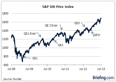 This bull market increasingly looks scary. Setting new record highs and extending deep into 2013 only makes it look more worrisome. It was only a little more than a year ago I recommended investors keep stocks as the largest portion of any long-term investment portfolio. But that advice came with the caveat that market risk would rise in 2013, and indeed I have become increasingly nervous about stocks this year. Although I have yet to declare a market top, and will not call a bear market until important technical levels are broken, I have not hesitated urging taking profits and raising cash levels by selling stocks as this market has set new record highs this year. Pictures can often convey more than words, and in this post I am going to highlight a few notable and scary charts related to the current stock market.