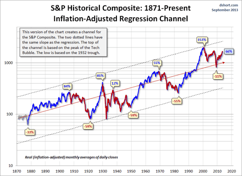 In my last post I argued that this stock market remains in a secular bear market. If that is true then we may have a long drop ahead. The below chart shows the long-term trend of the stock market, since 1871, through secular bull and bear markets. Secular bear markets typically go below trend, which would necessitate a significant and sustained drop from the market’s current heights. Despite some recent John Hancock commercials you may have seen on television telling investors now is the time to think about getting back into the stock market and surveys showing the wealthy getting more aggressive about stock allocations, according to the below chart this might be one of the worst times ever to invest if we return to the secular bear norm and spend time below trend.