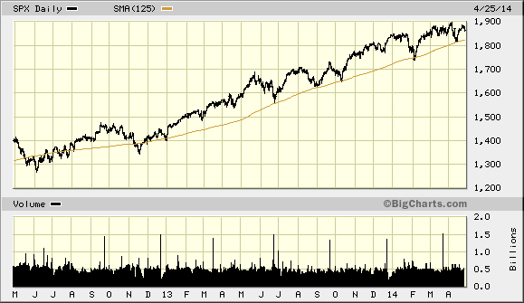 In fact since the start of 2013 the stock market has been saying that buyers will keep setting higher highs and higher lows by stepping in to consistently support the stock market at its 125-day moving average. The below chart clearly shows buying support coming in at a level, which might seem arbitrary, but clearly has meant something to this market for well over a year. So, I’m going to listen to the market and not even consider becoming an outright bear, as long as buyers keep on holding the line—in this case the line in the chart where the 125-day moving average exists.