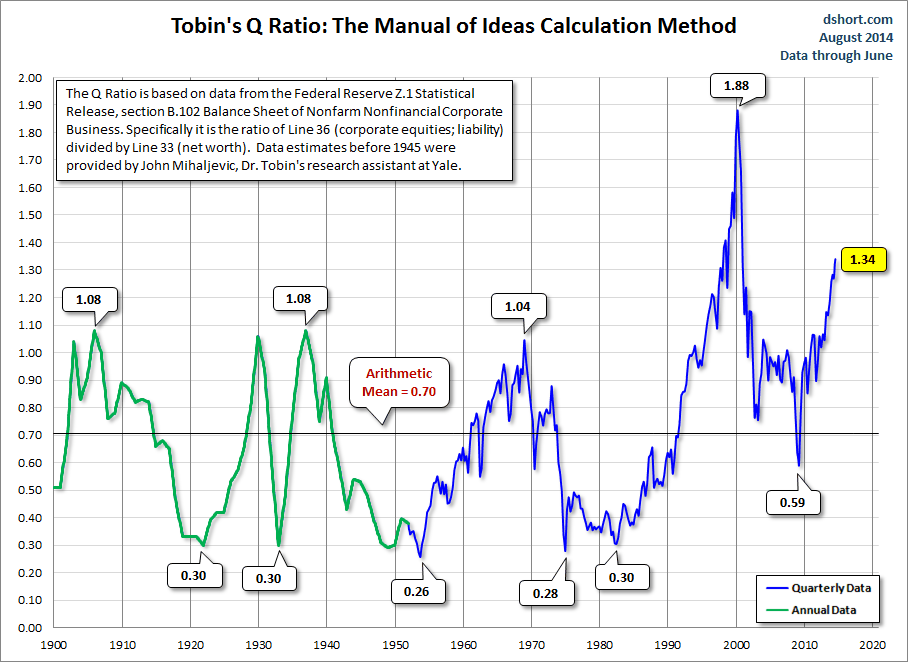 Today, these valuation methods are unanimous that stocks are expensive and as a result are predicting ten year returns going forward of under two percent rather than the long-term average of ten percent. As a result, a substantial price decline is the most likely path for stocks to get back to more reasonable valuations with average expected forward returns. All this comes with the caveat that these valuation models are not market timing tools, as their correlation to ten-year rather than one-year returns illustrates. The S&P 500 could become more expensive, as it did in 2000, before the market then collapsed. John Hussman has received a lot of criticism for being overly negative on stocks, partly based on this type of analysis, even as the stock market has risen to new heights. In my opinion the work Hussman has done on valuations deserves serious consideration, and multiple posts are available on his website to read about his methods. But they should be studied with the caveat that they are not particularly useful in timing the market; only in determining whether it is a good long-term value for investors or not. Right now it’s not.