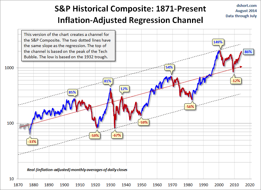 Unlike the other valuation methods in the above charts, regression to trend is an indirect, but still very useful method, for valuing the stock market. Over very long periods the economy, corporate earnings and stock prices tend to grow at steady and consistent rates. When stock prices rise too high they eventually regress back to their long-term trend line oftentimes overshooting well below. With the current stock market well above trend, history suggests it is simply a matter of time until a major price decline brings the  market back to or below trend.