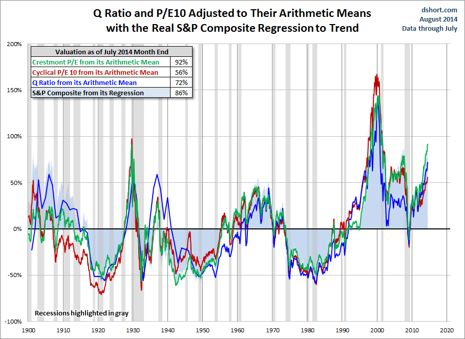 Another excellent resource for studying the value of the stock market is the Advisor Perspectives financial website dshort.com. The below chart shows four methods for valuing the stock market, including the S&P 500 from its regression, and three ratios (two of which are also included in Hussman’s chart) plotted against their arithmetic mean: Crestmont Research’s Crestmont P/E; the Cyclical P/E 10 a.k.a. the Schiller P/E; and Tobin’s Q ratio. This chart again demonstrates that reliable methods for valuing the stock market indicate the current market is very expensive and does not represent a good value for stock investors.