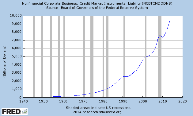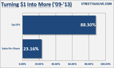 Along with wage suppression, financial engineering has also played a major role in elevating corporate profits. And it also has significant negative implications for stock investors. The below bar chart courtesy of STA Wealth Management compares the growth in operating earnings per share of S&P 500 companies of over 88 percent versus sales growth of over 23 percent from January 2009 to December 2013. The difference between the two numbers is largely financial engineering or as some might call them accounting tricks, e.g. amortization, one-time write offs, depreciation and stock buybacks. But there are limits to pushing earnings higher through financial engineering, rather than actual sales growth, and there are also consequences, particularly in the case of share buybacks.