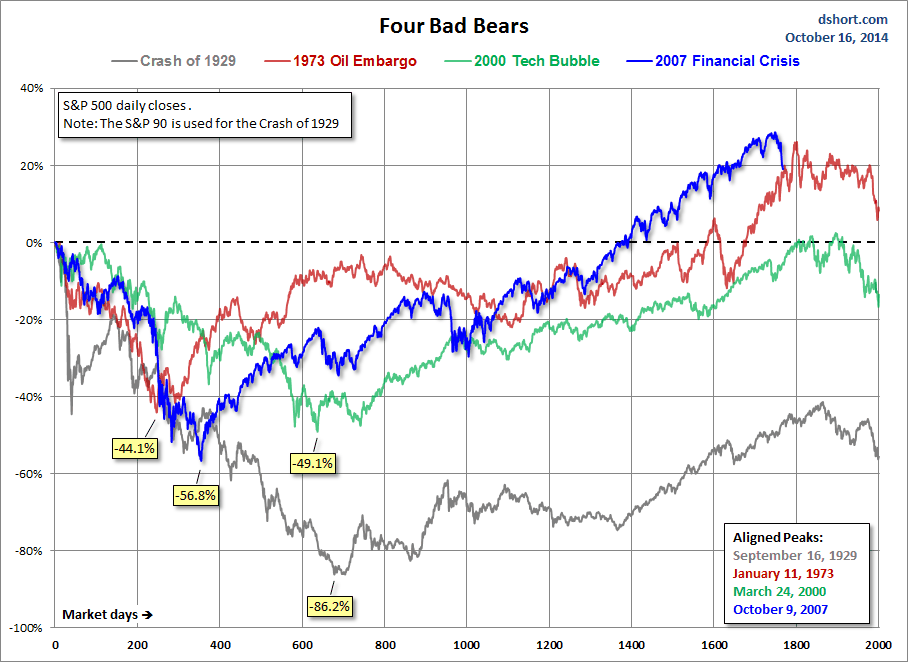 Both this bull market and economic recovery are beyond the average respective duration, and that should be reason for worry. This is an old bull market that based on history is far more likely to be near its end than its beginning. Other historical comparisons also give reason to worry. The below chart courtesy of Doug Short shows bad-bear-to-bull market cycles (Crash of 1929, 1973 oil embargo, 2000 Tech Crisis and the 2007 Financial Crisis). These comparisons show that such bad-bear-to-bull cycles have a long duration that typically runs for very similar time periods, and would imply a market top within a few more months. Then again, maybe this bad-bear-to-bull cycle will run longer than the others. And maybe this market will run far longer than the average, on the order of the 1990-2000 bull market. Maybe one of the weakest economic recoveries of the last century will generate one of the strongest, longest bull markets ever. But the level of confidence being exhibited from investors, currently holding and buying stocks at these levels, in such an optimistic outcome, seems misplaced at best.
