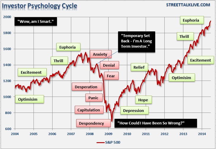 After stocks steadily climbing for over five years, there is good reason to now be getting fearful instead of greedy, when you look at historical precedent, as well as underlying fundamentals. Instead, current popular opinion seems to now treat any sell off as a buying opportunity. As stocks sold off recently there were few worries expressed of a market top. Instead, the consensus seemed to be to urge investors not to panic and to hold onto stocks, if not to buy more on the dips. This is in stark contrast to the early years of this bull market, where the fear of a double dip recession seemed omnipresent. There are many examples of this change in sentiment, but one of my favorites to illustrate just how far away we have moved from fear to greed is this recent Bloomberg article “Why the Stock Market Rally is Bad News,” detailing how the recent rally in stock prices after the sell off is bad news, because the selling didn’t last long enough for more investors to buy stocks, before the market returns to its inexorable rise. There just doesn’t seem to be a lot of fear or panic, and that is actually bad news for those holding stocks.